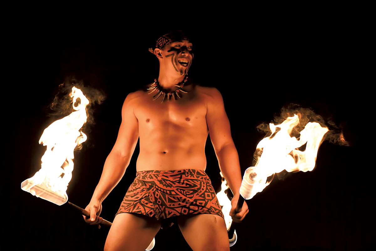 As evening falls, the stage comes alive with captivating performances that journey through the cultures of Hawai‘i, Tahiti, Samoa, and New Zealand—culminating in a thrilling Samoan fire-knife dance under the stars.